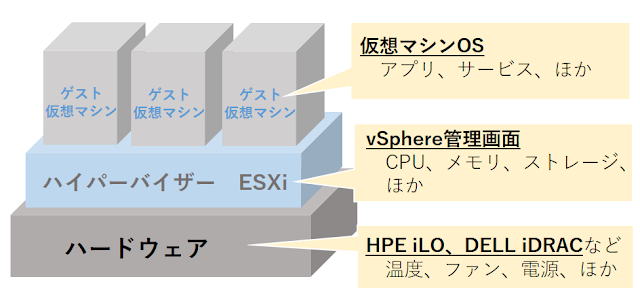 VMware vSphereによるサーバー仮想化環境の構成はハードウェア、ハイパーバイザー、ゲスト仮想マシン、この3つのレイヤーで成り立っています。